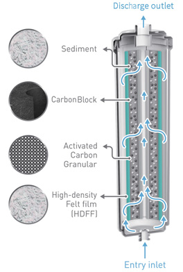Tested with proven efficiency by Korea Testing & Research Institute [KTR], 99.9% of E.Coli and Staphylococcus Aureus bacteria is removed, based on pore size of 0.1 microns. Suspended colloids are also removed while seesntial mineral are kept intact.